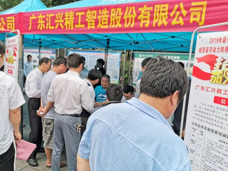 由威信縣委、縣政府,東莞市大嶺山鎮(zhèn)黨委、政府主辦,威信縣人社局、東莞市大嶺山鎮(zhèn)人社分局承辦的“2019年夏季東莞市大嶺山鎮(zhèn)對口幫扶威信縣農(nóng)村勞動力轉(zhuǎn)移就業(yè)專場招聘會”在云南威信縣體育館廣場隆重舉行。此次招聘會有來自廣東省大嶺山鎮(zhèn)的名優(yōu)企業(yè)10余家,大嶺山鎮(zhèn)提供就業(yè)崗位500余個。招聘會現(xiàn)場氣氛熱烈,其中匯興智造集團(tuán)招聘位置前排成長長的隊(duì)伍,應(yīng)聘者禮貌有序地排隊(duì)填寫應(yīng)聘表。