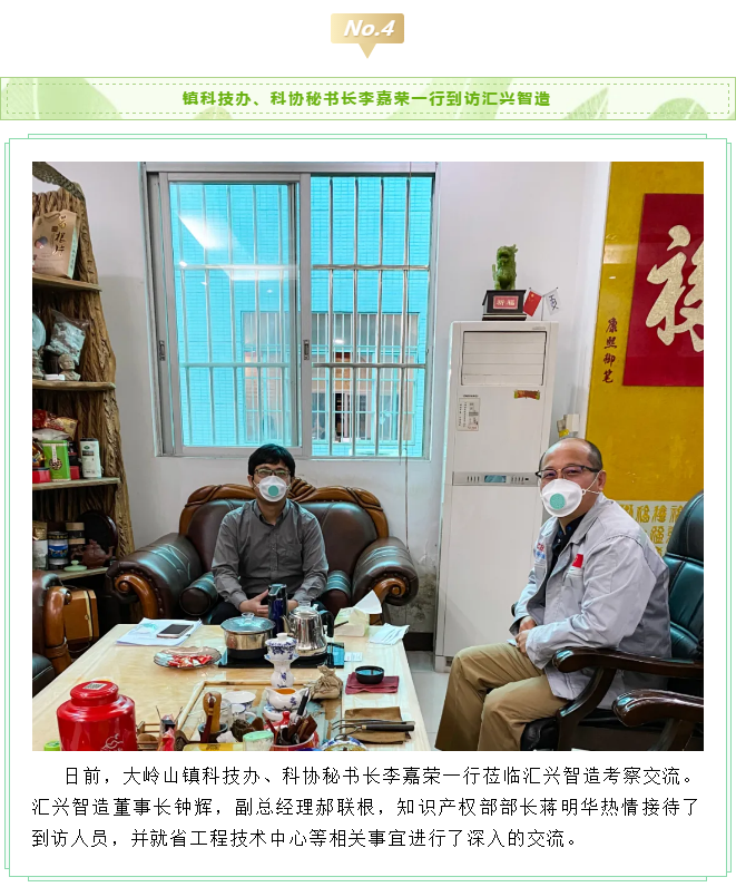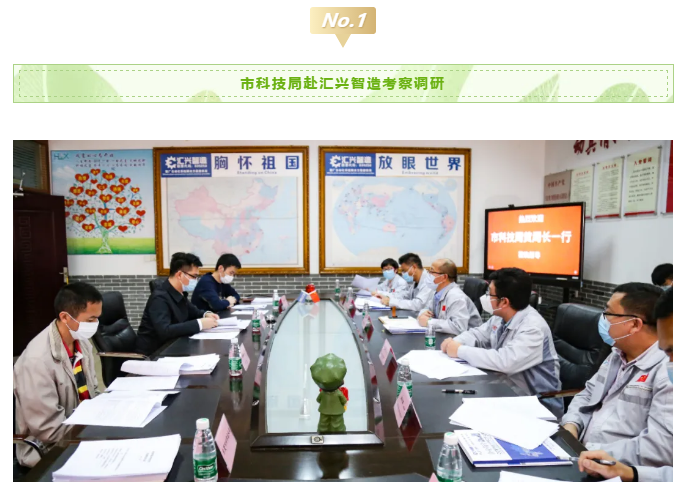 2020年3月11日,市科技局副局長黃天梁、科長李耀球、主任科員劉宇豪蒞臨匯興智造考察市重大科技項目攻關情況。匯興智造董事長鐘輝、技術總監(jiān)丁度坤博士、財務總監(jiān)彭理仕,副總經(jīng)理彭大海及知識產權部部長蔣明華等項目相關人員列席了會議。