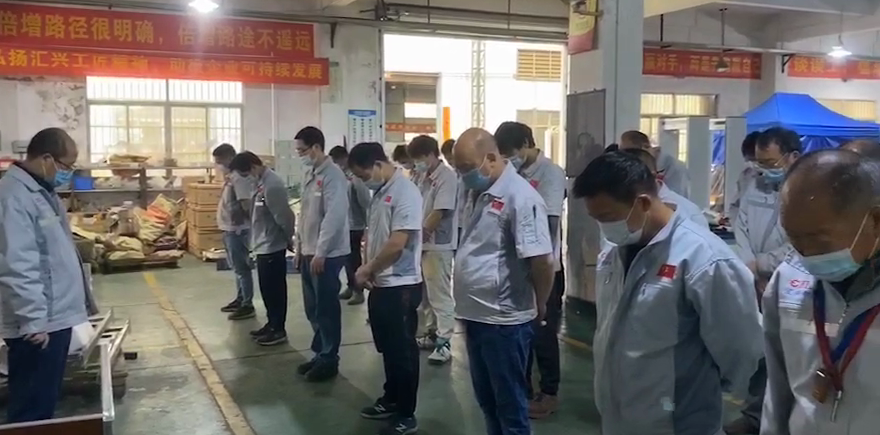 上午十點,董事長鐘輝親率生產(chǎn)車間仍在加班趕工口罩機的在廠員工,進行3分鐘哀悼,大家神情凝重肅立,靜立默哀。匯興全體員工以此表達對抗擊新冠肺炎疫情斗爭犧牲烈士和逝世同胞的深切哀悼。逝者安息,生者堅強。