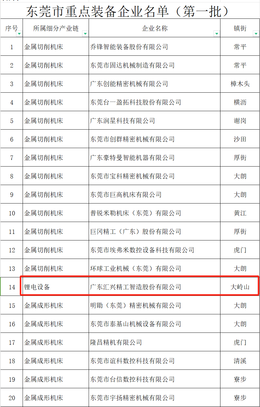 ▲ 廣東匯興精工智造股份有限公司非常榮幸進入2024年首批“東莞市重點裝備企業”名單(是大嶺山鋰電設備唯一入選單位)。